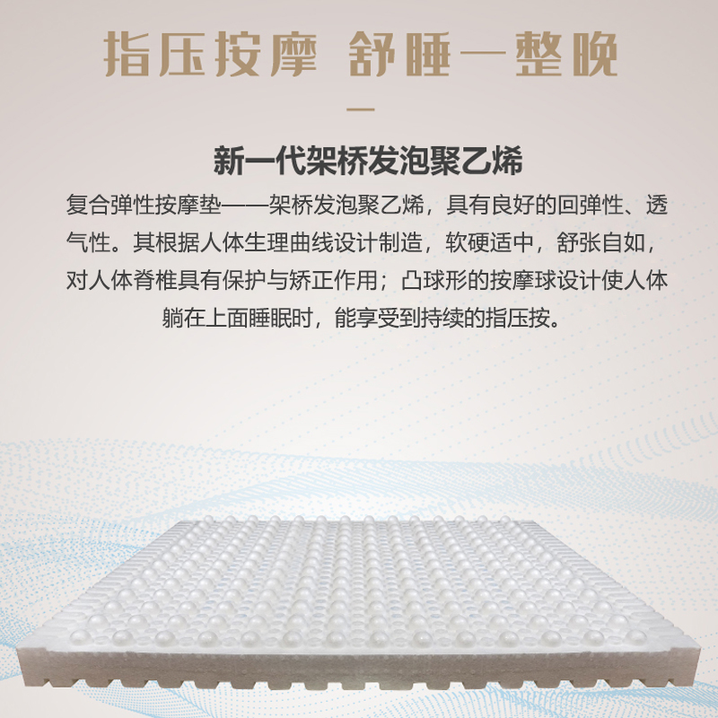 内芯材质:远红外功能层、恒定能量磁场层、进口环保架桥按摩层、抗菌防螨功能层